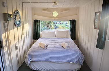 The Detention Shed is a popular choice for families or groups of three or four. It can function as either two separate rooms or a two-bedroom unit, with an attached bathroom for convenience. If booking the two-bedroom unit option, please note that due to the building's repurposed design, the layout is linear. Bathroom access from the twin room is either through the double room or around the outside of the building. It’s a bit quirky, but it works—as long as you know what to expect! The main bedroom is set up with a Queen bed, while the second room has two Single beds. Both rooms can be locked off from each other internally and also have external locking, allowing them to function as separate rooms (Detention Shed Double and Detention Shed Twin). The bathroom is located off a small enclosed porch area with an external door.